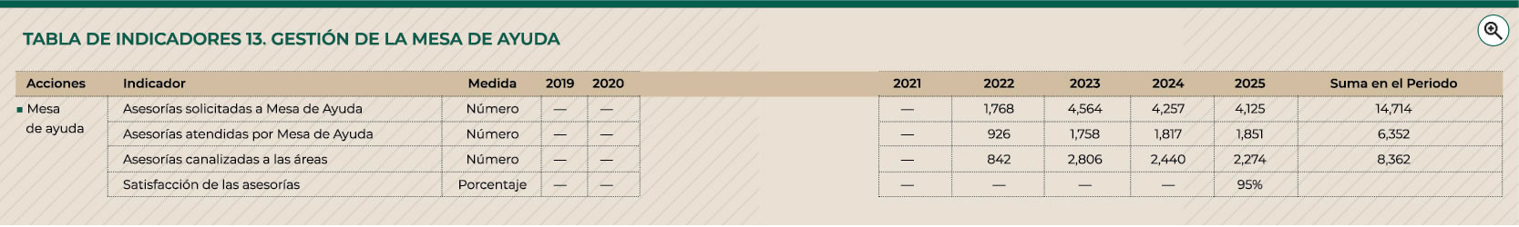 Entre 2022 y 2025, la Mesa de Ayuda recibió un total de 14,714 solicitudes de asesoría, todas ellas atendidas hasta su conclusión. De este total, 6,352 fueron resueltas de manera inmediata y directa por la Mesa de Ayuda, mientras que 8,362 fueron canalizadas a otras áreas para su atención especializada.