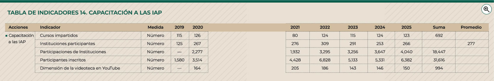 En el período, se impartieron 692 cursos, con un número acumulado de 18,447 IAP inscritas y un promedio de 277 instituciones anualmente. En cuanto a las personas capacitadas, se reportó un total de 31,616 participantes inscritos, en los que se incluyen, desde 2024, personas de otras entidades federativas, ampliando, de ese modo el alcance geográfico del programa.