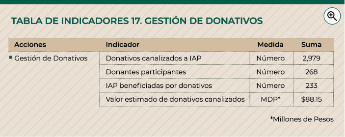 Durante el período informado la Junta canalizó un total de 2,979 donativos en especie, por un monto estimado de $ 88.15 millones de pesos, procedentes de 268 donantes, habiéndose beneficiado un total de 233 Instituciones.