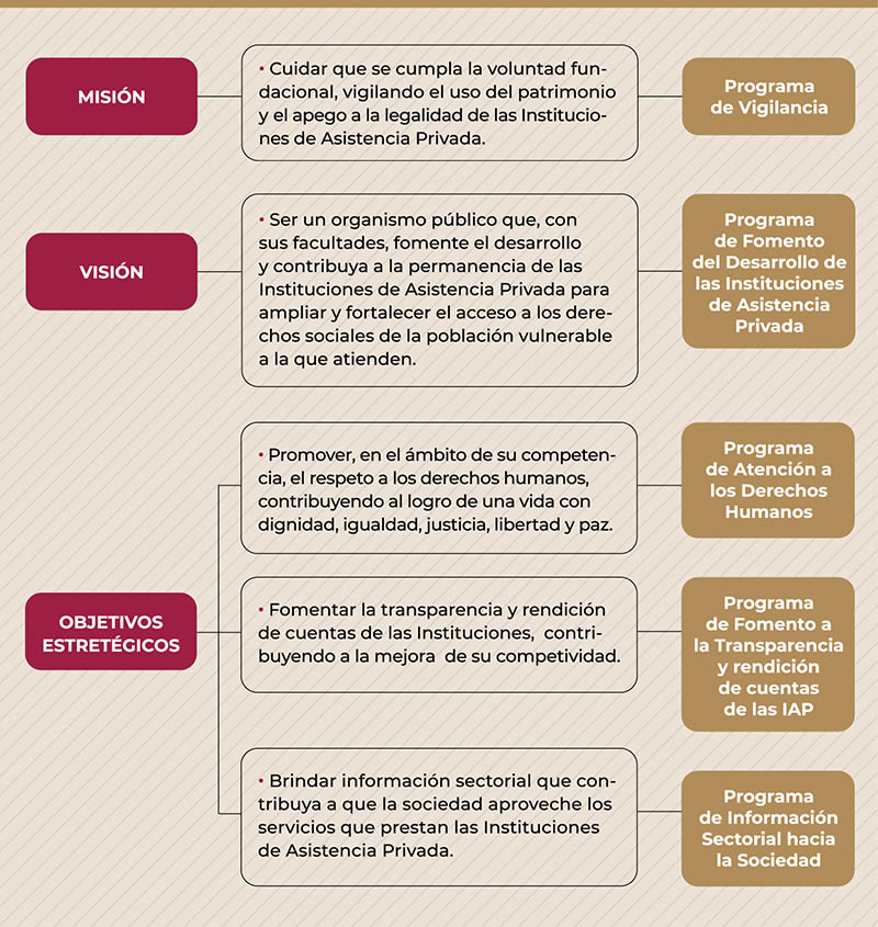 - Visión: Ser un organismo público que, con sus facultades, fomente el desarrollo y contribuya a la permanencia de las Instituciones de Asistencia Privada para ampliar y fortalecer el acceso a los derechos sociales de la población vulnerable a la que atienden.